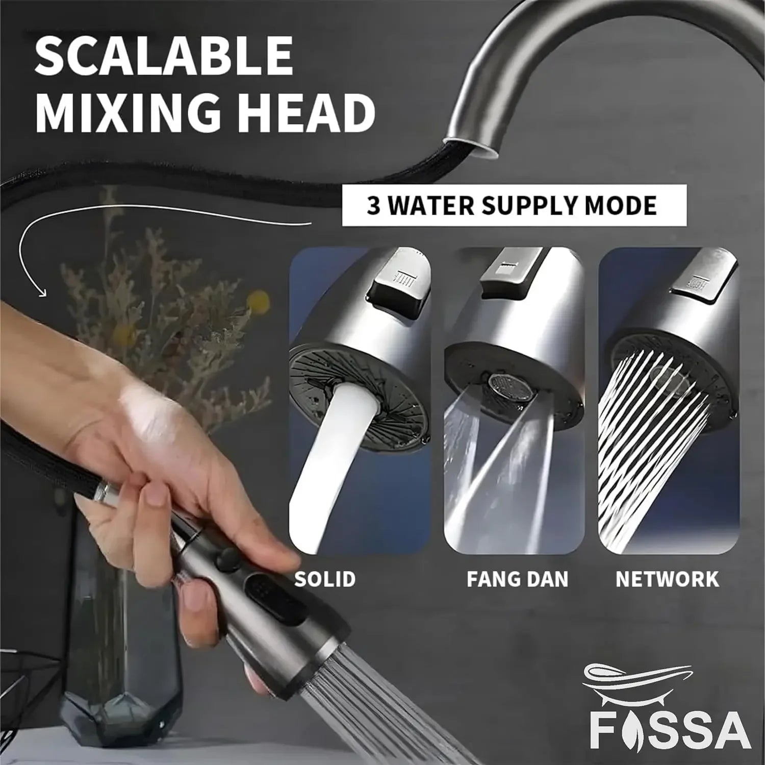The sink is made using Premium-grade stainless steel and has a modern finish in black. This sink is a single basin design with usable space and has an integrated pull-out faucet, RO tap, and waterfall system to make everyday tasks easier.